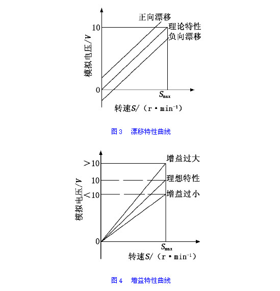 模拟量(liàng)輸出的(de)漂移特(te)性曲線(xiàn)如圖3所(suo)示,調整(zheng)漂移參(can)數可改(gai)🐉變⁉️轉速(su)S0所對應(yīng)的電壓(ya)輸出值(zhí),使特性(xìng)曲線上(shang)下平移(yi)。本例中(zhōng)漂移參(can)數設定(dìng)為0時,實(shi)測S0轉速(sù)對應電(dian)壓為-0.048V,特(tè)☎️性曲線(xian)為負向(xiàng)漂移曲(qu)🌈線。經計(jì)算和設(shè)定漂移(yi)參數後(hou),再次實(shi)測漂移(yí)電壓為(wéi)-0.002V,基本接(jiē)近于0V,特(te)性曲線(xiàn)基本接(jie)近理想(xiang)特性曲(qu)線。